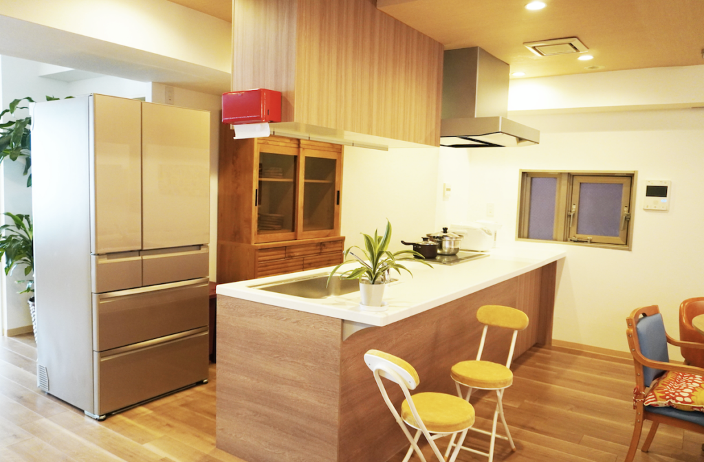 木調のオープンキッチンで、ゲストの皆様にもお料理や食器洗い等にもご参加いただく中で、「生活リハビリ」につながる工夫もしています。