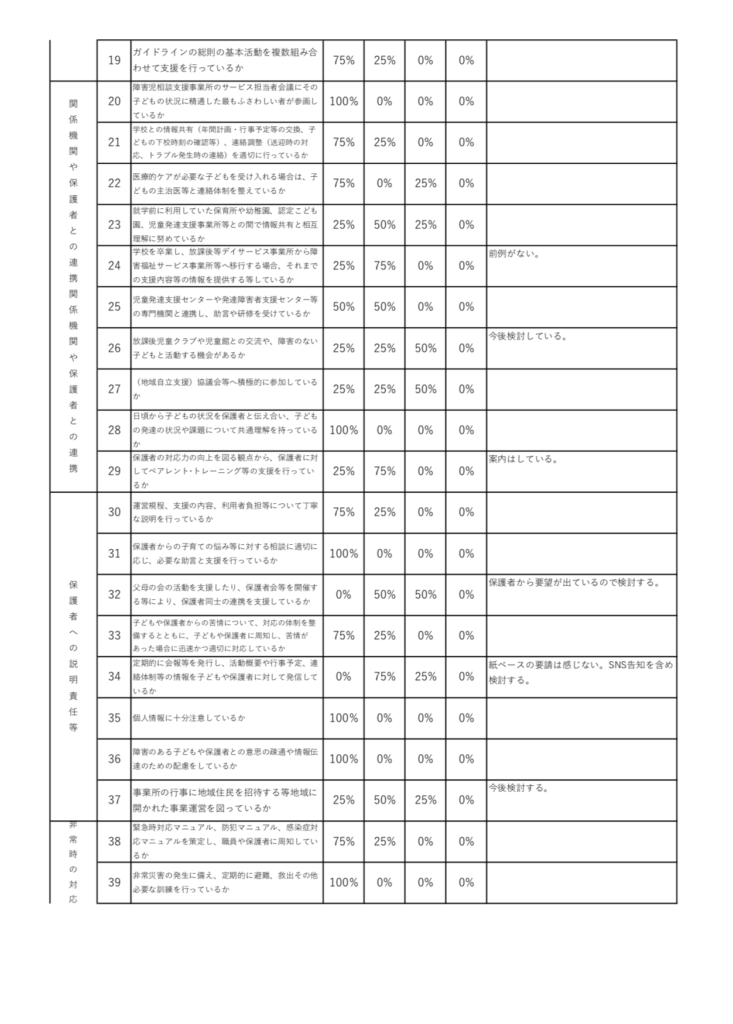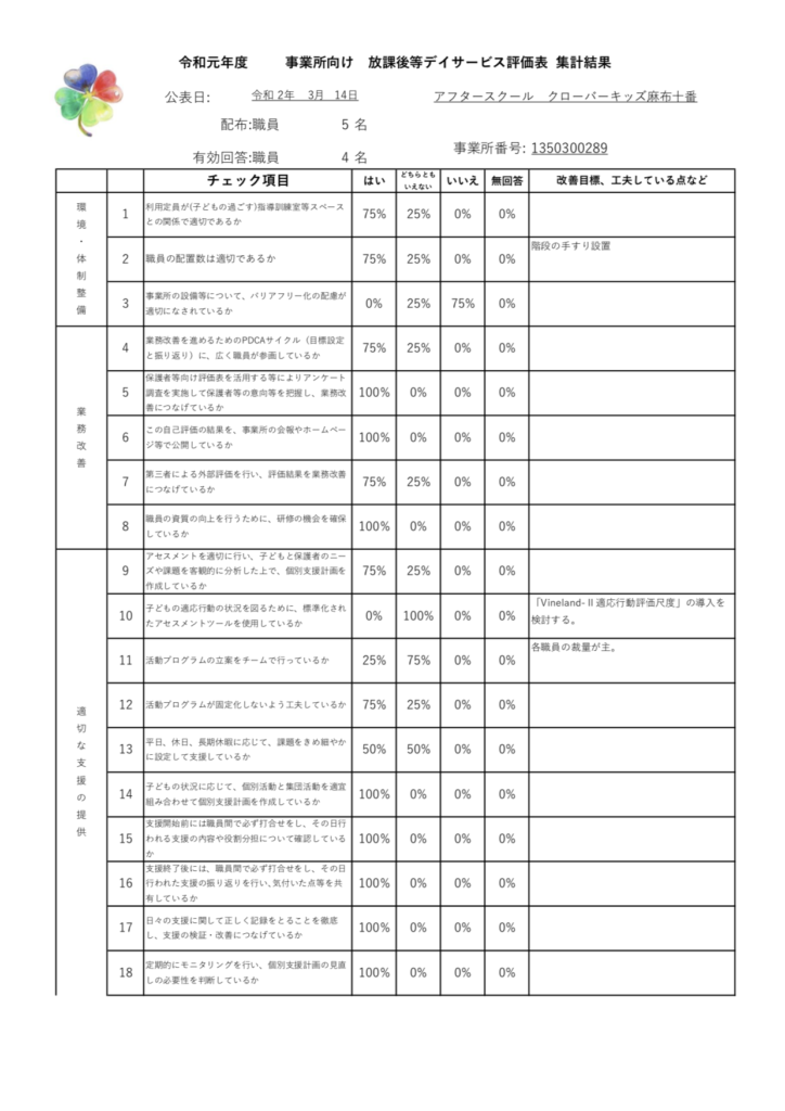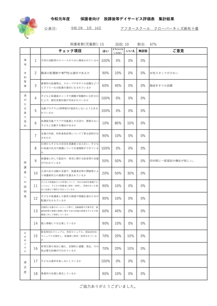 令和2年1月から2月にかけて、放課後等デイサービスガイドラインに基づき、「アフタースクールクローバーキッズ麻布十番」の保護者様からの評価、スタッフの自己評価をアンケート形式にて実施いたしました。貴重なご意見、ご要望をたくさんいただきました。これらを参考として、今後の支援に活かせるよう努めてまいります。アンケートにご協力いただきました皆様には心より厚く御礼申し上げます。