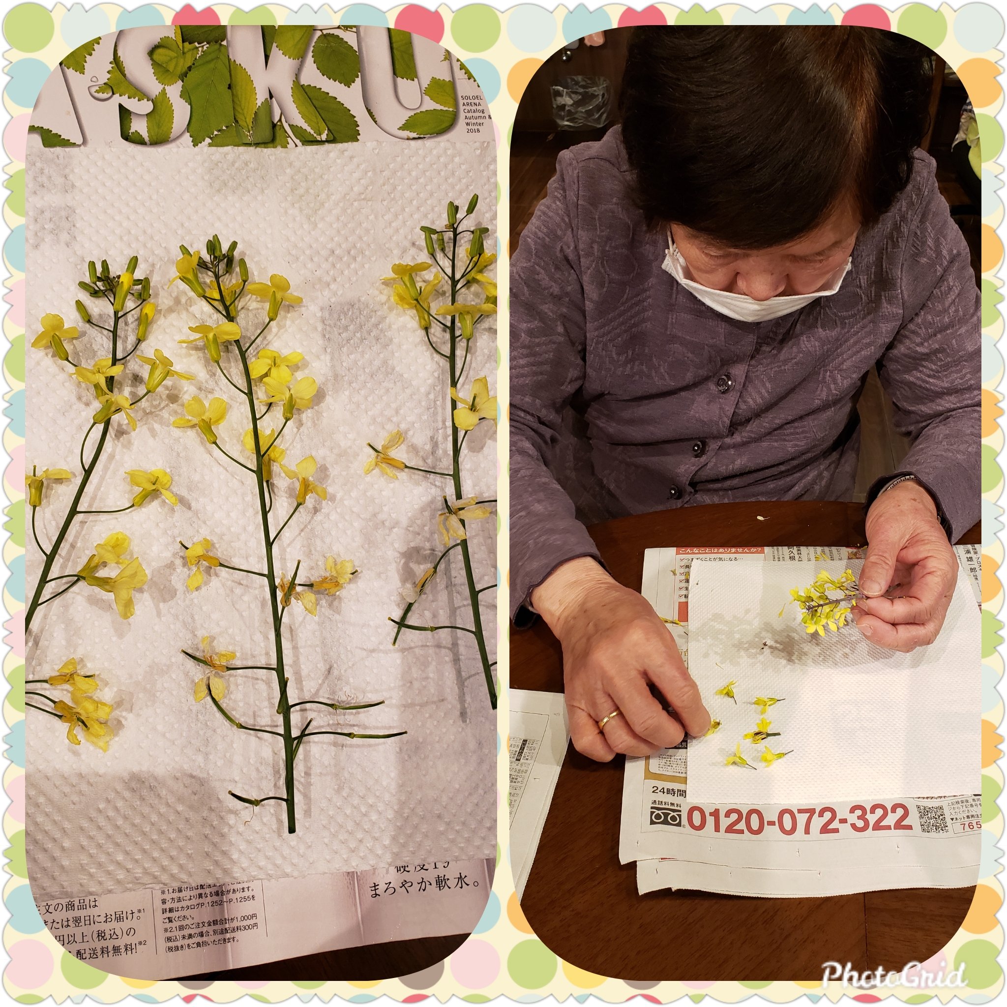 葉ぼたんとスティックセニョールは、同じアブラナ科。黄色くて可愛い4枚の花びらが十文字なのが特徴です。簡単押し花、1週間くらいで押せちゃいます。