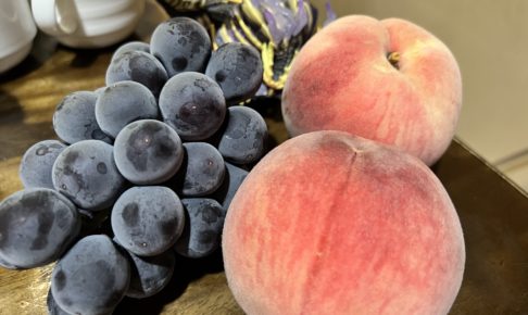 美味しそうな、こうかな‥? ブドウと モモです。 置き方、こうかな? どうかな? 「重いな」 「ほぉー‥モモで…