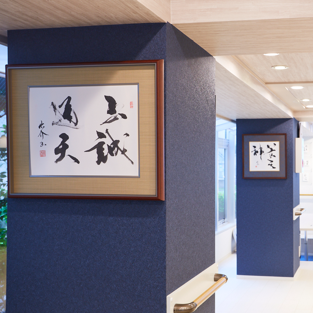 デイサービスクローバー芝公園は、「芝公園駅」から徒歩5分の場所に立地する建物の1階にあります。内装コンセプトは「書」。書道家としても活動しているクローバーのスタッフが書き上げた「書」作品が飾られています。